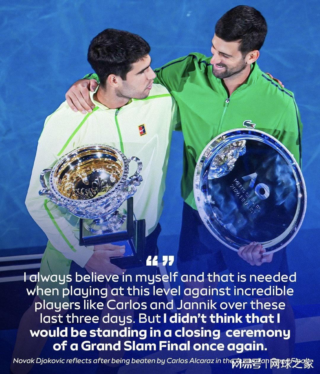 在2026年的墨尔本,德约虽然没有捧起冠军奖杯,但他展现了比冠军更珍贵的东西——一位伟大运动员的成熟、尊严与不断追逐的精神。正如他所说:“我离胜利很近,真的近在咫尺,但终究无缘得手。”网球比赛总有胜负,但对卓越的追求永无止境。而这份追求,正是他留给所有网球迷最宝贵的财富。(来源:网球之家 作者:Mei )